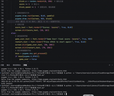 import pygameimport random# 初始化Pygamepygame.init()screen = pygame.display.set_mode((400, 500))pygame.display.set_caption("打方块小游戏")clock = pygame.time.Clock()# 定义颜色WHITE = (255,255,255)BLUE = (0,0,255)RED = (255,0,0)# 挡板设置paddle = pygame.Rect(150, 450, 100, 10)paddle_speed = 8# 方块设置block = pygame.Rect(random.randint(0, 350), 0, 50, 50)block_speed = 5# 分数score = 0font = pygame.font.SysFont("Times New Roman", 24)running = Truegame_over = Falsewhile running:screen.fill(WHITE) # 白色背景if not game_over:# 1. 事件处理(移动挡板)keys = pygame.key.get_pressed()if keys[pygame.K_LEFT] and paddle.left > 0:paddle.x -= paddle_speedif keys[pygame.K_RIGHT] and paddle.right < 400:paddle.x += paddle_speed# 2. 方块下落block.y += block_speed# 方块落地,游戏结束if block.bottom > 500:game_over = True# 3. 碰撞检测(挡板接住方块)if paddle.colliderect(block):block.y = 0 # 方块回到顶部block.x = random.randint(0, 350) # 随机位置score += 1 # 得分+1block_speed += 1 # 速度加快,增加难度# 绘制挡板和方块pygame.draw.rect(screen, BLUE, paddle)pygame.draw.rect(screen, RED, block)# 绘制分数score_text = font.render(f"Scores: {score}", True, BLUE)screen.blit(score_text, (10, 10))else:# 游戏结束界面game_over_text = font.render(f"Game Over! Final score: {score}", True, RED)restart_text = font.render("Press SPACE to start again~", True, BLUE)screen.blit(game_over_text, (50, 200))screen.blit(restart_text, (70, 250))# 按空格键重新开始keys = pygame.key.get_pressed()if keys[pygame.K_SPACE]:game_over = Falsescore = 0block = pygame.Rect(random.randint(0, 350), 0, 50, 50)block_speed = 5# 关闭窗口for event in pygame.event.get():if event.type == pygame.QUIT:running = Falsepygame.display.update()clock.tick(60)pygame.quit()