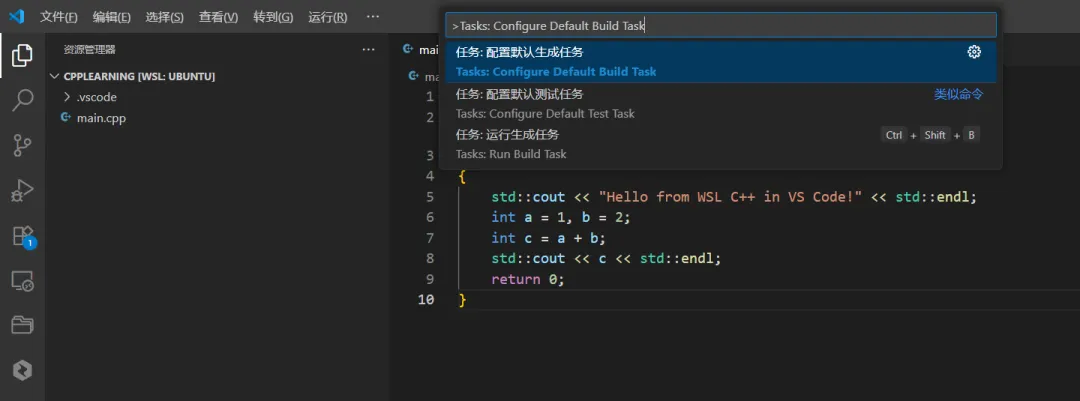 创建方式:按 Ctrl+Shift+P,输入 Tasks: Configure Default Build Task,选择 g++ build active file。