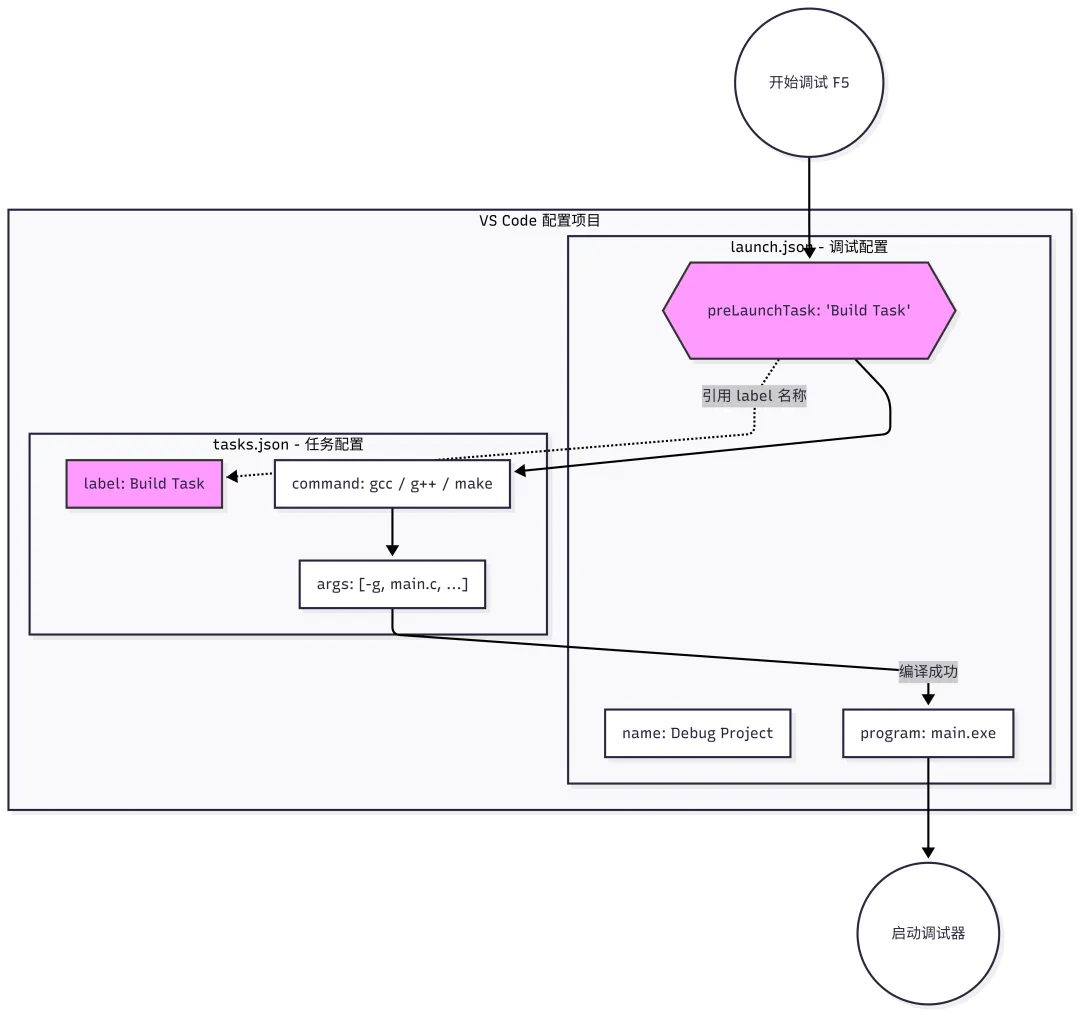 VS Code 调试的自动化是通过项目根目录下 .vscode 文件夹的 JSON 配置文件实现的。