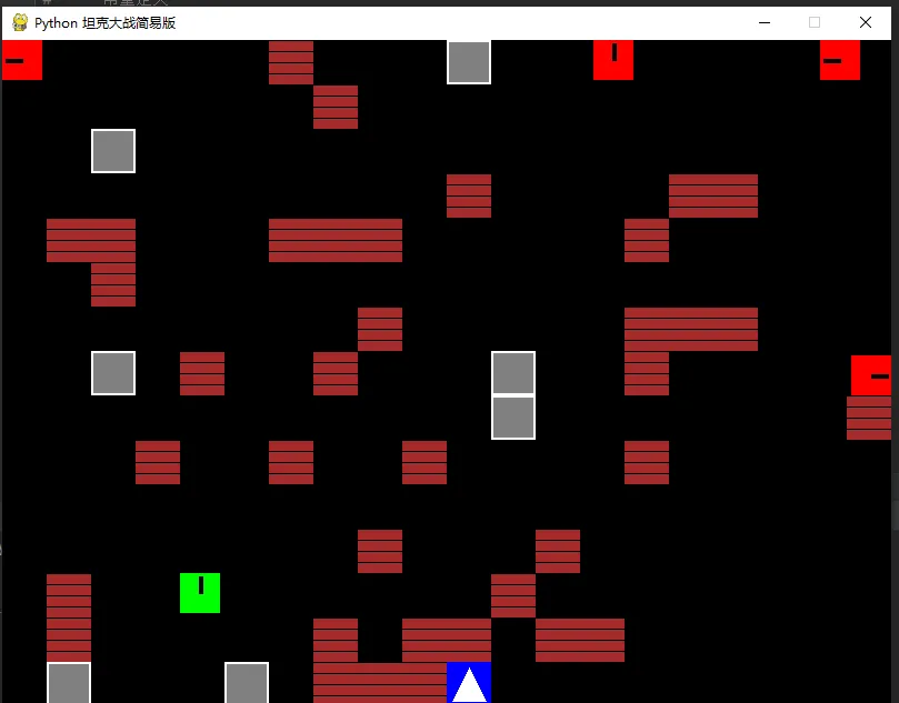 import pygameimport randomimport sys# --- 常量定义 ---SCREEN_WIDTH = 800SCREEN_HEIGHT = 600FPS = 60BLOCK_SIZE = 40 # 坦克和墙壁的大小# 颜色定义BLACK = (0, 0, 0)WHITE = (255, 255, 255)GREEN = (0, 255, 0) # 玩家颜色RED = (255, 0, 0) # 敌人颜色GRAY = (128, 128, 128) # 钢墙BROWN = (165, 42, 42) # 砖墙BLUE = (0, 0, 255) # 基地YELLOW = (255, 255, 0) # 子弹# 方向定义UP = 0DOWN = 1LEFT = 2RIGHT = 3# --- 类定义 ---class Bullet(pygame.sprite.Sprite): def __init__(self, x, y, direction, owner): super().__init__() self.image = pygame.Surface((6, 6)) self.image.fill(YELLOW) self.rect = self.image.get_rect() self.rect.center = (x, y) self.direction = direction self.speed = 7 self.owner = owner # 'player' or 'enemy' def update(self): if self.direction == UP: self.rect.y -= self.speed elif self.direction == DOWN: self.rect.y += self.speed elif self.direction == LEFT: self.rect.x -= self.speed elif self.direction == RIGHT: self.rect.x += self.speed # 超出屏幕移除 if (self.rect.bottom < 0 or self.rect.top > SCREEN_HEIGHT or self.rect.right < 0 or self.rect.left > SCREEN_WIDTH): self.kill()class Tank(pygame.sprite.Sprite): def __init__(self, x, y, color, is_player=True): super().__init__() self.image = pygame.Surface((BLOCK_SIZE - 4, BLOCK_SIZE - 4)) self.image.fill(color) self.rect = self.image.get_rect() self.rect.topleft = (x, y) self.color = color self.is_player = is_player self.speed = 3 self.direction = UP self.cooldown = 0 self.original_image = self.image.copy() # 绘制一个简单的炮管指示方向 self._draw_barrel() def _draw_barrel(self): self.image = self.original_image.copy() center = (self.image.get_width() // 2, self.image.get_height() // 2) if self.direction == UP: pygame.draw.line(self.image, BLACK, center, (center[0], center[1] - 15), 4) elif self.direction == DOWN: pygame.draw.line(self.image, BLACK, center, (center[0], center[1] + 15), 4) elif self.direction == LEFT: pygame.draw.line(self.image, BLACK, center, (center[0] - 15, center[1]), 4) elif self.direction == RIGHT: pygame.draw.line(self.image, BLACK, center, (center[0] + 15, center[1]), 4) def move(self, dx, dy, direction, walls): old_x, old_y = self.rect.x, self.rect.y self.direction = direction self.rect.x += dx self.rect.y += dy # 边界检查 if self.rect.left < 0: self.rect.left = 0 if self.rect.right > SCREEN_WIDTH: self.rect.right = SCREEN_WIDTH if self.rect.top < 0: self.rect.top = 0 if self.rect.bottom > SCREEN_HEIGHT: self.rect.bottom = SCREEN_HEIGHT # 墙壁碰撞检查 hit_list = pygame.sprite.spritecollide(self, walls, False) if hit_list: self.rect.x, self.rect.y = old_x, old_y return False # 移动失败 self._draw_barrel() return True # 移动成功 def shoot(self): if self.cooldown == 0: self.cooldown = 30 # 射击冷却帧数 center_x = self.rect.centerx center_y = self.rect.centery return Bullet(center_x, center_y, self.direction, 'player' if self.is_player else 'enemy') return None def update(self): if self.cooldown > 0: self.cooldown -= 1class Player(Tank): def __init__(self, x, y): super().__init__(x, y, GREEN, is_player=True) self.speed = 4 def update(self, keys, walls): super().update() dx, dy = 0, 0 moved = False if keys[pygame.K_UP]: dy = -self.speed self.move(0, dy, UP, walls) moved = True elif keys[pygame.K_DOWN]: dy = self.speed self.move(0, dy, DOWN, walls) moved = True elif keys[pygame.K_LEFT]: dx = -self.speed self.move(dx, 0, LEFT, walls) moved = True elif keys[pygame.K_RIGHT]: dx = self.speed self.move(dx, 0, RIGHT, walls) moved = True # 如果没有按键,保持当前朝向但不移动(可选逻辑,这里为了流畅性不做处理)class Enemy(Tank): def __init__(self, x, y): super().__init__(x, y, RED, is_player=False) self.speed = 2 self.move_timer = 0 self.current_move_duration = 0 def ai_move(self, walls): super().update() if self.move_timer <= 0: # 改变方向和移动时长 self.direction = random.choice([UP, DOWN, LEFT, RIGHT]) self.current_move_duration = random.randint(30, 90) self.move_timer = self.current_move_duration self._draw_barrel() dx, dy = 0, 0 if self.direction == UP: dy = -self.speed elif self.direction == DOWN: dy = self.speed elif self.direction == LEFT: dx = -self.speed elif self.direction == RIGHT: dx = self.speed if not self.move(dx, dy, self.direction, walls): # 撞墙了,立即换方向 self.move_timer = 0 self.move_timer -= 1class Wall(pygame.sprite.Sprite): def __init__(self, x, y, type='brick'): super().__init__() self.type = type self.image = pygame.Surface((BLOCK_SIZE, BLOCK_SIZE)) if type == 'steel': self.image.fill(GRAY) # 画个边框表示钢墙 pygame.draw.rect(self.image, WHITE, (0,0, BLOCK_SIZE, BLOCK_SIZE), 2) else: # brick self.image.fill(BROWN) # 画点砖块纹理 for i in range(0, BLOCK_SIZE, 10): pygame.draw.line(self.image, BLACK, (0, i), (BLOCK_SIZE, i)) self.rect = self.image.get_rect() self.rect.topleft = (x, y)class Base(pygame.sprite.Sprite): def __init__(self, x, y): super().__init__() self.image = pygame.Surface((BLOCK_SIZE, BLOCK_SIZE)) self.image.fill(BLUE) # 画个星星或标志 pygame.draw.polygon(self.image, WHITE, [(20, 5), (35, 35), (5, 35)]) self.rect = self.image.get_rect() self.rect.topleft = (x, y) self.alive = True# --- 主游戏逻辑 ---def create_map(): walls = pygame.sprite.Group() # 简单的地图布局 # 0: 空, 1: 砖, 2: 钢 layout = [ "00000000000000000000", "01100110000011001100", "01100110000011001100", "01100110022001100110", "00000000022000000000", "01100110000011001100", "01100110000011001100", "00000000000000000000", "01100001111000001100", "01100001001000001100", "000000010B0100000000", # B is base placeholder "00000001111100000000", ] # 由于布局较小,我们重复填充或拉伸以适应屏幕,这里简单生成 # 重新设计一个适合 800x600 (20x15 blocks) 的地图 map_data = [] for r in range(15): row = "" for c in range(20): if r == 14 and 9 <= c <= 10: # 基地位置 if c == 9: continue # 左边围墙 if c == 10: continue # 右边围墙 if r == 13 and 