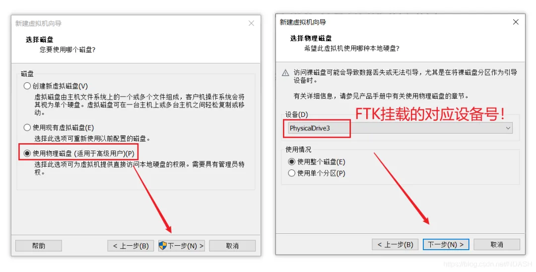 选择“使用物理磁盘”,选择 FTK Imager 挂载起来的对应驱动器号。