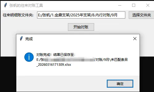 # 导入必要库import tkinter as tkfrom tkinter import ttk, filedialog, messageboximport pandas as pdimport osfrom datetime import datetimefrom difflib import SequenceMatcher# 创建主窗口root = tk.Tk()root.title("往来对账工具")root.geometry("500x150")# 全局变量存储文件夹路径folder_path = tk.StringVar()def select_folder(): """选择往来明细账文件夹路径""" path = filedialog.askdirectory() if path: folder_path.set(path)def standardize_columns(df): """标准化列名""" columns = df.columns for col in columns: if '借方' in col: df = df.rename(columns={col: '借方金额'}) elif '贷方' in col: df = df.rename(columns={col: '贷方金额'}) elif '摘要' in col: df = df.rename(columns={col: '摘要'}) return dfdef start_reconciliation(): """开始对账主函数""" try: # 获取文件夹路径并检查 path = folder_path.get() if not path: raise ValueError("请先选择文件夹路径") # 获取文件夹内的Excel文件 files = [f for f in os.listdir(path) if f.endswith(('.xls', '.xlsx'))] if len(files) != 2: raise ValueError("文件夹内必须包含两个Excel文件") # 读取两个Excel文件并标准化列名 df1 = pd.read_excel(os.path.join(path, files[0])) df2 = pd.read_excel(os.path.join(path, files[1])) df1 = standardize_columns(df1) df2 = standardize_columns(df2) # 第一步核对:单条匹配 def single_match(df_a, df_b): """单条借贷方匹配逻辑""" matched_a = [] matched_b = [] for idx_a, row_a in df_a.iterrows(): for idx_b, row_b in df_b.iterrows(): # 检查金额相等且借贷方向相反 if (row_a['借方金额'] == row_b['贷方金额'] and row_a['借方金额'] != 0) or \ (row_a['贷方金额'] == row_b['借方金额'] and row_a['贷方金额'] != 0): matched_a.append(idx_a) matched_b.append(idx_b) return df_a.drop(matched_a), df_b.drop(matched_b) # 执行双向匹配 remaining1, remaining2 = single_match(df1, df2) remaining2, remaining1 = single_match(remaining2, remaining1) # 第二步核对:摘要相似性分组匹配 def group_match(df_a, df_b): """摘要分组匹配逻辑""" # 生成摘要分组关键词(示例使用简单相似度匹配) groups = {} for idx, row in df_a.iterrows(): found = False for key in groups: # 判断摘要相似度(阈值可调整) if SequenceMatcher(None, key, row['摘要']).ratio() > 0.6: groups[key].append(idx) found = True break if not found: groups[row['摘要']] = [idx] # 检查分组金额是否匹配 matched_a = [] matched_b = [] for key, indices in groups.items(): sum_debit = df_a.loc[indices, '借方金额'].sum() sum_credit = df_a.loc[indices, '贷方金额'].sum() # 在df_b中寻找匹配项 for idx_b, row_b in df_b.iterrows(): if (sum_debit == row_b['贷方金额'] and sum_debit != 0) or \ (sum_credit == row_b['借方金额'] and sum_credit != 0): matched_a.extend(indices) matched_b.append(idx_b) break return df_a.drop(matched_a), df_b.drop(matched_b) # 执行双向分组匹配 final1, final2 = group_match(remaining1, remaining2) final2, final1 = group_match(final2, final1) # 生成结果文件 timestamp = datetime.now().strftime("%Y%m%d%H%M%S") output_path = os.path.join(path, f'未匹配条目_{timestamp}.xlsx') with pd.ExcelWriter(output_path) as writer: final1.to_excel(writer, sheet_name=files[0][:30], index=False) final2.to_excel(writer, sheet_name=files[1][:30], index=False) messagebox.showinfo("完成", f"对账完成!结果已保存至:\n{output_path}") except Exception as e: messagebox.showerror("错误", str(e))# 创建界面组件ttk.Label(root, text="往来明细账文件夹:").grid(row=0, column=0, padx=5, pady=5)ttk.Entry(root, textvariable=folder_path, width=40).grid(row=0, column=1, padx=5)ttk.Button(root, text="选择文件夹", command=select_folder).grid(row=0, column=2, padx=5)ttk.Button(root, text="开始对账", command=start_reconciliation).grid(row=1, column=1, pady=10)# 运行主循环root.mainloop()
