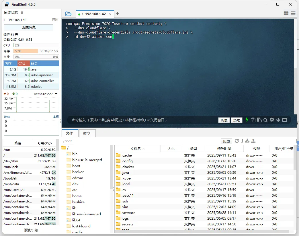 certbot certonly \ --dns-cloudflare \ --dns-cloudflare-credentials /root/secrets/cloudflare.ini \ -d dev42.axfier.com
