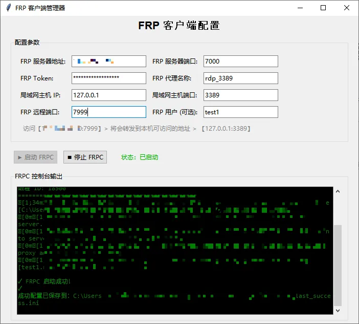 - 启动成功:状态变为"已启动"(绿色),显示"✓ FRPC 启动成功!"
