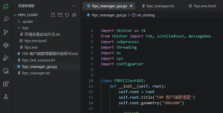 frpc_client/├── frpc_manager_gui.py # 主程序├── frpc_manager.ini # 配置文件(首次运行自动生成)├── frpc_last_success.ini # 最后一次成功配置(启动成功后生成)└── frpc/ ├── frpc.exe # FRP 客户端程序 └── frpc.env.toml # FRP 配置文件模板