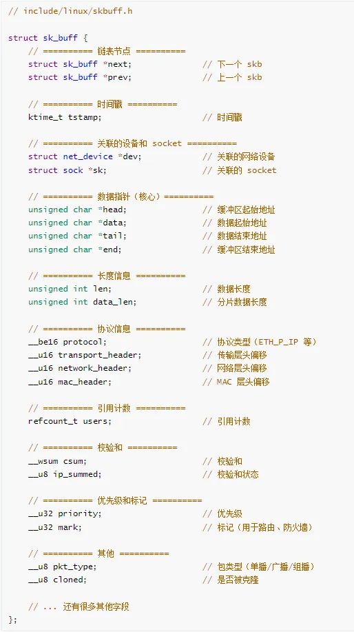 sk_buff(socket buffer)是网络子系统中最核心的数据结构,代表一个网络数据包。