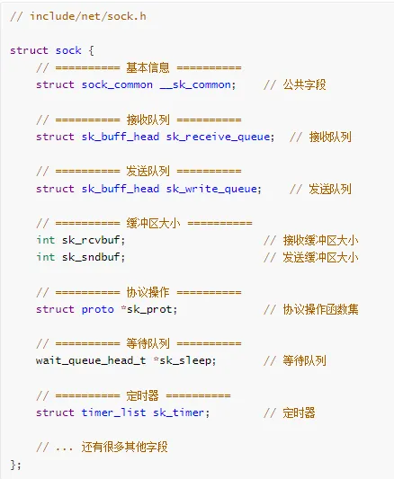 // include/linux/net.hstruct socket {socket_state state; // socket 状态short type; // socket 类型(SOCK_STREAM/SOCK_DGRAM)unsigned long flags; // socket 标志struct file *file; // 关联的文件对象struct sock *sk; // 关联的传输层 sockconststruct proto_ops *ops; // 协议操作函数集};