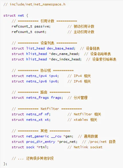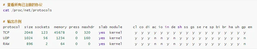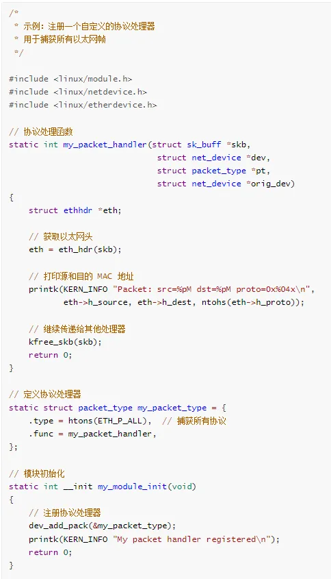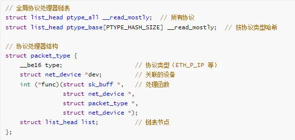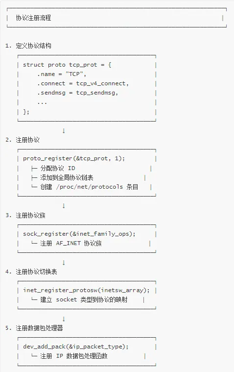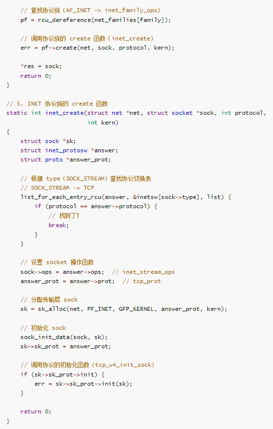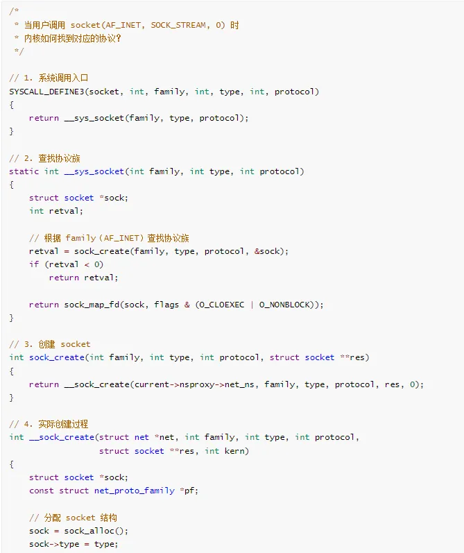 // TCP 协议定义struct prototcp_prot = {.name="TCP",.owner=THIS_MODULE,.close=tcp_close,.connect=tcp_v4_connect,.disconnect=tcp_disconnect,.accept=inet_csk_accept,.ioctl=tcp_ioctl,.init=tcp_v4_init_sock,.destroy=tcp_v4_destroy_sock,.shutdown=tcp_shutdown,.setsockopt=tcp_setsockopt,.getsockopt=tcp_getsockopt,.sendmsg=tcp_sendmsg,.recvmsg=tcp_recvmsg,.backlog_rcv=tcp_v4_do_rcv,.hash=inet_hash,.unhash=inet_unhash,.get_port=inet_csk_get_port,// ... 更多操作函数};// INET 协议族操作static const struct net_proto_family inet_family_ops= {.family=PF_INET,.create=inet_create, // 创建 socket 的函数.owner=THIS_MODULE,};// INET 协议切换表statics truct inet_protos winetsw_array[] = {{.type=SOCK_STREAM,.protocol=IPPROTO_TCP,.prot=&tcp_prot,.ops=&inet_stream_ops,.flags=INET_PROTOSW_PERMANENT|INET_PROTOSW_ICSK,},{.type=SOCK_DGRAM,.protocol=IPPROTO_UDP,.prot=&udp_prot,.ops=&inet_dgram_ops,.flags=INET_PROTOSW_PERMANENT,},{.type=SOCK_RAW,.protocol=IPPROTO_IP,.prot=&raw_prot,.ops=&inet_sockraw_ops,.flags=INET_PROTOSW_REUSE,}};