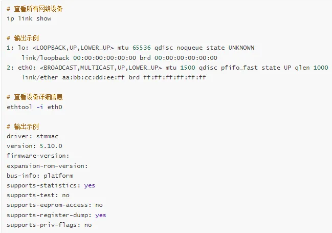 Q3:如何查看网络设备的驱动?A:使用 ethtool -i <interface> 命令。
