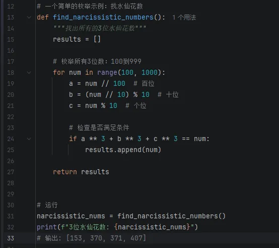 比如找3位的水仙花数。水仙花数(Narcissistic Number,也译作 “自恋数”“阿姆斯特朗数”)是指一个 n 位正整数,其每个位上的数字的 n 次幂之和 等于它本身。