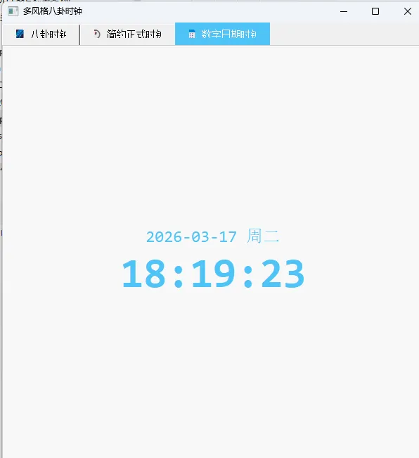 import sysimport mathfrom PyQt5.QtWidgets import (QApplication, QWidget, QTabWidget, QVBoxLayout, QLabel)from PyQt5.QtGui import QPainter, QColor, QPen, QBrush, QFont, QPolygonFfrom PyQt5.QtCore import (Qt, QTimer, QPointF, QRectF, QTime, QDateTime, QPropertyAnimation, QEasingCurve)# ====================== Tab1:八卦时钟 ======================classBaguaClock(QWidget):def__init__(self): super().__init__() self.timer = QTimer() self.timer.timeout.connect(self.update) self.timer.start(1000)defpaintEvent(self, event): painter = QPainter(self) painter.setRenderHint(QPainter.Antialiasing) painter.setRenderHint(QPainter.SmoothPixmapTransform) cx = self.width() / 2 cy = self.height() / 2 radius = min(cx, cy) - 20 self.draw_background(painter, cx, cy, radius) self.draw_bagua(painter, cx, cy, radius) self.draw_yin_yang(painter, cx, cy, radius * 0.7) self.draw_scales(painter, cx, cy, radius) self.draw_hands(painter, cx, cy, radius)defdraw_background(self, painter, cx, cy, r): painter.setBrush(QColor(20, 20, 20)) painter.setPen(Qt.NoPen) painter.drawEllipse(QPointF(cx, cy), r, r)defdraw_yin_yang(self, painter, cx, cy, r): painter.setPen(Qt.NoPen) painter.setBrush(QColor(255, 255, 255)) painter.drawChord(QRectF(cx-r, cy-r, 2*r, 2*r), 90*16, 180*16) painter.setBrush(QColor(0, 0, 0)) painter.drawChord(QRectF(cx-r, cy-r, 2*r, 2*r), 270*16, 180*16) painter.setBrush(QColor(0, 0, 0)) painter.drawEllipse(QPointF(cx, cy - r/2), r/5, r/5) painter.setBrush(QColor(255, 255, 255)) painter.drawEllipse(QPointF(cx, cy + r/2), r/5, r/5)defdraw_bagua(self, painter, cx, cy, r): guas = ["乾", "兌", "離", "震", "巽", "坎", "艮", "坤"] angles = [-90, -45, 0, 45, 90, 135, 180, 225] painter.setFont(QFont("Microsoft YaHei", 14, QFont.Bold)) painter.setPen(QColor(200, 200, 200))for name, angle in zip(guas, angles): rad = math.radians(angle) x = cx + (r * 0.82) * math.cos(rad) y = cy + (r * 0.82) * math.sin(rad) fm = painter.fontMetrics() w = fm.width(name) h = fm.height() painter.drawText(QPointF(x - w/2, y + h/4), name)defdraw_scales(self, painter, cx, cy, r): painter.setPen(QPen(QColor(255, 220, 150), 3))for i in range(12): angle = math.radians(i * 30 - 90) x1 = cx + (r - 20) * math.cos(angle) y1 = cy + (r - 20) * math.sin(angle) x2 = cx + r * math.cos(angle) y2 = cy + r * math.sin(angle) painter.drawLine(QPointF(x1, y1), QPointF(x2, y2)) painter.setPen(QPen(QColor(150, 150, 150), 1))for i in range(60):if i % 5 == 0:continue angle = math.radians(i * 6 - 90) x1 = cx + (r - 10) * math.cos(angle) y1 = cy + (r - 10) * math.sin(angle) x2 = cx + r * math.cos(angle) y2 = cy + r * math.sin(angle) painter.drawLine(QPointF(x1, y1), QPointF(x2, y2))defdraw_hands(self, painter, cx, cy, r): time = QTime.currentTime() hour = time.hour() % 12 minute = time.minute() second = time.second() h_angle = math.radians((hour + minute / 60) * 30 - 90) self.draw_hand(painter, cx, cy, h_angle, r * 0.45, 8, QColor(255, 220, 150)) m_angle = math.radians((minute + second / 60) * 6 - 90) self.draw_hand(painter, cx, cy, m_angle, r * 0.6, 5, QColor(180, 180, 180)) s_angle = math.radians(second * 6 - 90) self.draw_hand(painter, cx, cy, s_angle, r * 0.7, 2, QColor(255, 80, 80)) painter.setBrush(QColor(255, 220, 150)) painter.setPen(Qt.NoPen) painter.drawEllipse(QPointF(cx, cy), 8, 8)defdraw_hand(self, painter, cx, cy, angle, length, width, color): pen = QPen(color, width, Qt.SolidLine, Qt.RoundCap, Qt.RoundJoin) painter.setPen(pen) x = cx + length * math.cos(angle) y = cy + length * math.sin(angle) painter.drawLine(QPointF(cx, cy), QPointF(x, y))# ====================== Tab2:简约正式时钟 ======================classFormalClock(QWidget):def__init__(self): super().__init__() self.timer = QTimer() self.timer.timeout.connect(self.update) self.timer.start(1000)defpaintEvent(self, event): painter = QPainter(self) painter.setRenderHint(QPainter.Antialiasing) cx = self.width() / 2 cy = self.height() / 2 r = min(cx, cy) - 30# 白色背景 + 灰色边框 painter.setBrush(QColor(253, 253, 253)) painter.setPen(QPen(QColor(200, 200, 200), 2)) painter.drawEllipse(QPointF(cx, cy), r, r)# 刻度 painter.setPen(QPen(QColor(80,80,80), 2))for i in range(12): ang = math.radians(i*30-90) x1 = cx + (r-15)*math.cos(ang) y1 = cy + (r-15)*math.sin(ang) x2 = cx + r*math.cos(ang) y2 = cy + r*math.sin(ang) painter.drawLine(QPointF(x1,y1), QPointF(x2,y2))# 时间 time = QTime.currentTime() h = time.hour()%12 m = time.minute() s = time.second()# 时针 hang = math.radians((h+m/60)*30-90) painter.setPen(QPen(QColor(40,40,40),6, Qt.SolidLine, Qt.RoundCap)) painter.drawLine(QPointF(cx,cy), QPointF(cx+r*0.5*math.cos(hang), cy+r*0.5*math.sin(hang)))# 分针 mang = math.radians((m+s/60)*6-90) painter.setPen(QPen(QColor(60,60,60),4, Qt.SolidLine, Qt.RoundCap)) painter.drawLine(QPointF(cx,cy), QPointF(cx+r*0.7*math.cos(mang), cy+r*0.7*math.sin(mang)))# 秒针 sang = math.radians(s*6-90) painter.setPen(QPen(QColor(220,60,60),2, Qt.SolidLine, Qt.RoundCap)) painter.drawLine(QPointF(cx,cy), QPointF(cx+r*0.85*math.cos(sang), cy+r*0.85*math.sin(sang)))# 中心 painter.setBrush(QColor(40,40,40)) painter.setPen(Qt.NoPen) painter.drawEllipse(QPointF(cx,cy),6,6)# ====================== Tab3:炫酷数字时钟 ======================classDigitalClock(QWidget):def__init__(self): super().__init__() layout = QVBoxLayout(self) self.label = QLabel() self.label.setAlignment(Qt.AlignCenter) self.label.setStyleSheet("color:#4FC3F7; font-family:Consolas;") layout.addWidget(self.label) self.setLayout(layout) self.timer = QTimer() self.timer.timeout.connect(self.update_time) self.timer.start(1000) self.anim = QPropertyAnimation(self.label, b"font") self.anim.setDuration(300) self.anim.setEasingCurve(QEasingCurve.OutQuad)defupdate_time(self): now = QDateTime.currentDateTime() date_str = now.toString("yyyy-MM-dd ddd") time_str = now.toString("HH:mm:ss") self.label.setText(f"<div style='font-size:24px'>{date_str}</div><div style='font-size:60px; font-weight:bold'>{time_str}</div>")# =====================