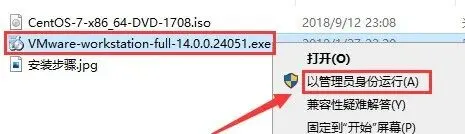3.选中【VMware-workstation-full-14.0.0.24051.exe】可执行文件,鼠标右击选择【以管理员的身份运行】。