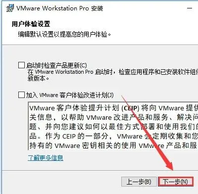 7.取消勾选【检查产品更新】和【客户体验改进计划】,然后点击【下一步】。