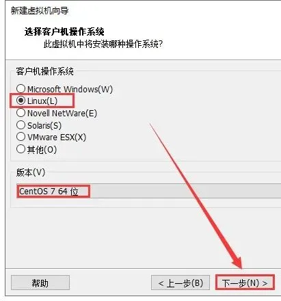 18.选择【Linux】,版本选择【CentOS 7 64位】,然后点击【下一步】。