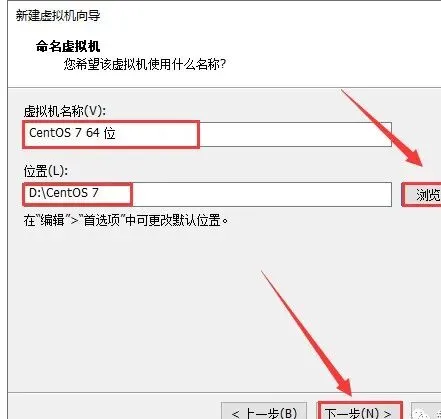 19.虚拟机名称输入【CentOS 7 64位】,点击【浏览】更改系统的安装位置,建议安装在除C盘之外的磁盘,然后点击【下一步】。