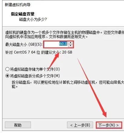 20.更改最大磁盘大小为60G,然后点击【下一步】。