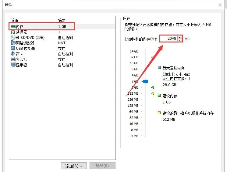 22.点击【内存】,设置为【2048MB】。