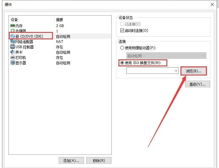 23.选择【新CD/DVD(SATA)】后选择【使用ISO镜像文件】,然后点击【浏览】。
