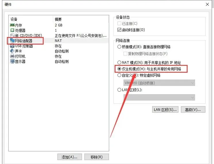 25.点击【网络适配器】,网络连接选择【仅主机模式】。