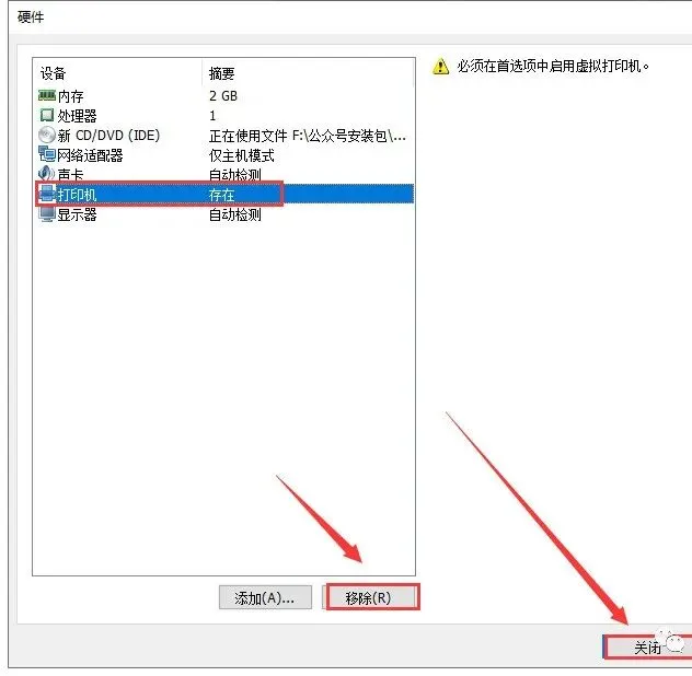 27.选中【打印机】,点击【移除】,然后点击【关闭】。