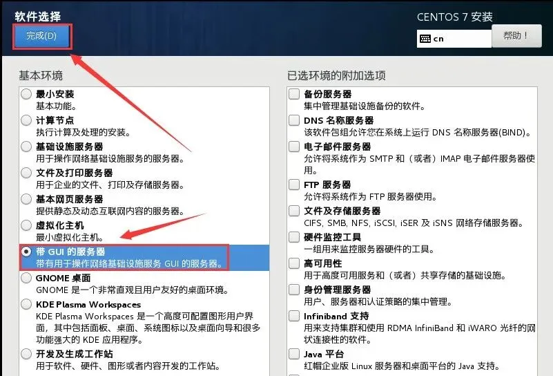 34.选择【带GUI的服务器】,然后点击【完成】。