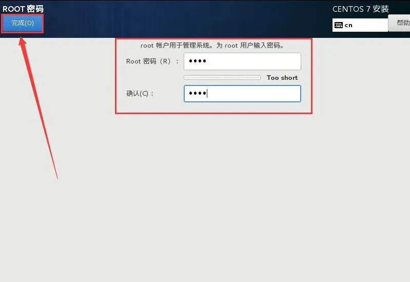 41.输入Root密码,然后点击【完成】。温馨提示:如果输入的密码较弱需要点击两次【完成】。