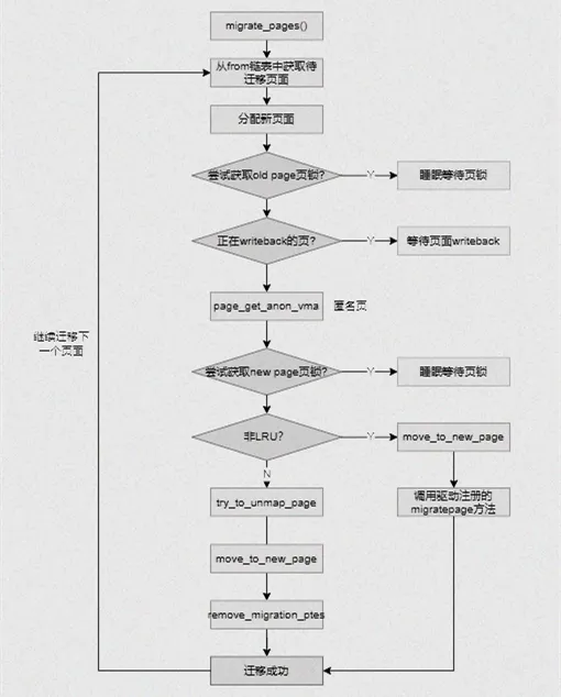 migrate_pages-------------------------------------页面迁移核心函数 unmap_and_move get_new_page------------------------------分配新页面 __unmap_and_move--------------------------迁移页面到新页面 move_to_new_page page_mapping----------------------找到页面对应的地址空间 migrate_page----------------------将旧页面的相关信息迁移到新页面 migrate_page_copy remove_migration_ptes-------------利用方向映射找到映射旧页面的每个PTE remove_migration_pte----------处理其中一个虚拟地址