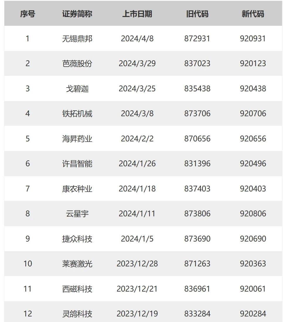 对于大部分个股可以看到前三位变成920,后三位不变,如872931->920931,但是直接读到8替换920的方式并不完全,因为也会有首位为4的情况,也会出现后三位变化的情况。