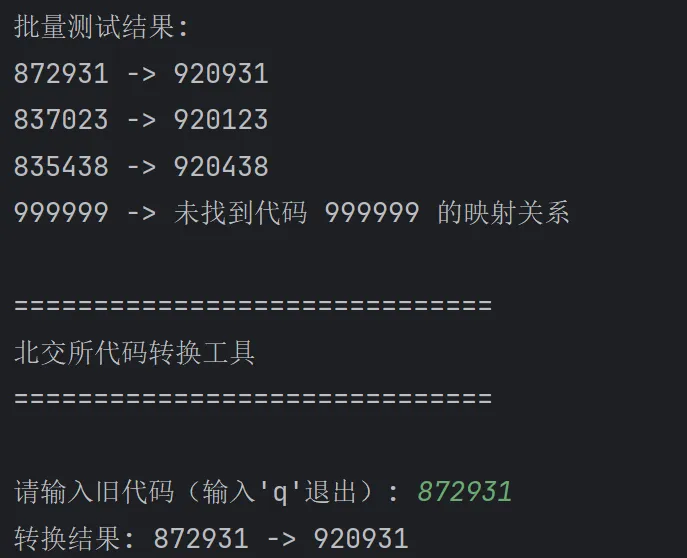 #encoding:gbkdef create_code_mapping():"""创建新旧代码映射字典"""# 根据提供的数据构建映射 mapping = {'872931': '920931','837023': '920123','835438': '920438','873706': '920706','870656': '920656','831396': '920496','837403': '920403','873806': '920806','873690': '920690','871263': '920363','836961': '920061','833284': '920284','831175': '920375','836547': '920547','873703': '920703','835579': '920579','873570': '920570','832522': '920522','873132': '920132','873679': '920679','873833': '920833','833030': '920130','839493': '920493','873693': '920693','873726': '920026','832786': '920786','832978': '920978','873665': '920665','832469': '920469','836419': '920519','831627': '920627','870976': '920976','872953': '920953','837174': '920274','836504': '920504','837748': '920748','834058': '920058','870726': '920926','832982': '920982','838701': '920701','833751': '920751','873576': '920576','837592': '920592','836717': '920717','832175': '920175','836208': '920208','832651': '920651','833455': '920455','836221': '920221','830779': '920779','430017': '920017','839719': '920719','832471': '920471','837006': '920006','838837': '920837','871478': '920578','836699': '920699','833394': '920394','871694': '920694','830896': '920896','831304': '920304','873593': '920593','872895': '920895','834261': '920261','839792': '920792','830809': '920809','430556': '920556','837663': '920663','833575': '920575','835857': '920057','872541': '920541','830974': '920974','836422': '920422','834770': '920770','430478': '920478','831906': '920906','839273': '920273','832149': '920249','834407': '920407','873167': '920367','832802': '920802','832023': '920023','430425': '920425','873152': '920252','839371': '920371','834950': '920950','872392': '920392','838262': '920262','831195': '920195','831855': '920855','872351': '920351','838227': '920227','873001': '920001','833781': '920781','836247': '920247','872190': '920190','430718': '920718','831526': '920526','873305': '920505','834033': '920033','830879': '920879','836807': '920807','838810': '920810','870508': '920608','833429': '920429','833171': '920571','836957': '920957','833075': '920075','834014': '920014','836414': '920414','870866': '920866','833230': '920230','836942': '920942','430300': '920300','831087': '920087','832110': '920110','831641': '920641','870199': '920199','872374': '920374','832662': '920662','835237': '920237','871634': '920634','872808': '920808','870357': '920357','873339': '920339','833914': '920914','832876': '920876','871753': '920753','430139': '920139','873527': '920527','835892': '920992','430476': '920476','837046': '920046','430685': '920685','838402': '920402','838971': '920971','873122': '920122','835207': '920207','839790': '920790','836270': '920270','836395': '920395','831152': '920152','831834': '920834','835985': '920985','836871': '920871','839725': '920725','834062': '920062','834639': '920639','837821': '920821','838670': '920870','833943': '920943','831278': '920378','430564': '920564','832491': '920491','870299': '920299','873223': '920223','838171': '920271','831167': '920267','833533': '920533','871970': '920970','833580': '920580','873169': '920169','831689': '920689','832419': '920419','835179': '920179','871857': '920857','833346': '920346','870204': '920204','871245': '920245','836720': '920720','871981': '920981','833873': '920873','831832': '920932','839680': '920680','833454': '920454','870436': '920436','836260': '920260','832171': '920171','832145': '920145','837092': '920092','832089': '920089','831305': '920405','838924': '920924','836892': '920892','872925': '920925','836077': '920077','835305': '920305','835174': '920174','831039': '920039','871642': '920642','832566': '920566','430090': '920090','871553': '920553','839946': '920146','832885': '920885','834765': '920765','831768': '920768','837212': '920212','833523': '920523','831726': '920726','832225': '920225','830832': '920832','834599': '920599','832735': '920735','836239': '920239','833427': '920427','838275': '920275','836826': '920826','833509': '920509','837344': '920344','836675': '920675','430510': '920510','831856': '920856','832000': '920000','835670': '920670','838030': '920030','430047': '920047','871396': '920396','830839': '920839','830964': '920964','831961': '920961','830946': '920946','833819': '920819','830799': '920799','839729': '920729','834682': '920682','835640': '920640','835508': '920508','430489': '920489','834475': '920475','831445': '920445','836433': '920433','430418': '920418','834415': '920415','831370': '920370','835368': '920368','832278': '920278','833266': '920266','836263': '920263','837242': '920242','430198': '920198','835185': '920185','835184': '920184','839167': '920167','838163': '920163','836149': '920149','834021': '920021','831010': '920010' }return mappingdef convert_code(old_code):""" 将旧代码转换为新代码 Args: old_code: 输入的旧代码(字符串类型) Returns: 新代码(如果存在映射)或提示信息(如果不存在) """ mapping = create_code_mapping()# 确保输入是字符串并去除可能的空格 old_code = str(old_code).strip()# 查找映射if old_code in mapping:return mapping[old_code]else:return f"未找到代码 {old_code} 的映射关系"# 交互式使用示例def main():print("北交所代码转换工具")print("=" * 30)while True: old_code = input("\n请输入旧代码(输入'q'退出): ").strip()if old_code.lower() == 'q':print("程序已退出")break new_code = convert_code(old_code)print(f"转换结果: {old_code} -> {new_code}")# 批量转换示例def batch_convert(old_codes):""" 批量转换多个代码 Args: old_codes: 旧代码列表 Returns: 转换结果字典 """ mapping = create_code_mapping() results = {}for code in old_codes: code = str(code).strip()if code in mapping: results[code] = mapping[code]else: results[code] = "未找到映射"return resultsif __name__ == "__main__":# 测试示例 test_codes = ['872931', '837023', '835438', '999999