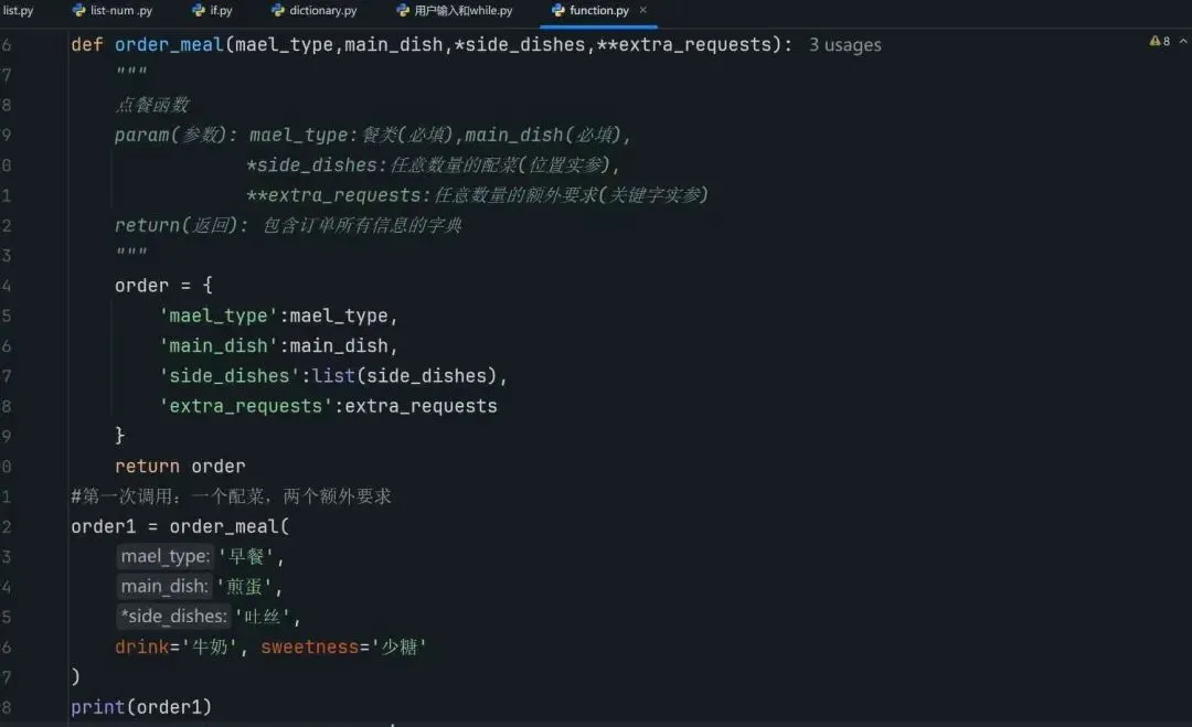 3.可以接受任意数量的关键字实参(**kwargs)表示额外的要求(如🍷、🥤)。
