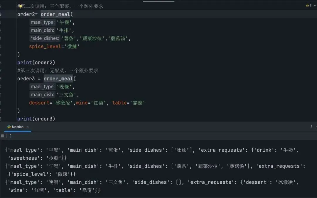 5.调用函数三次,每次提供不同数量的配菜和额外要求。最后打印返回的字典。