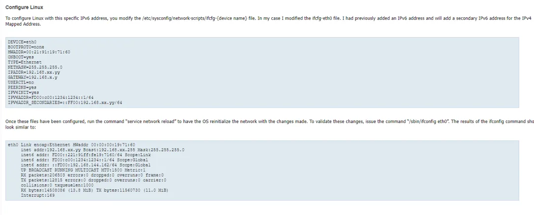 In 12.1.0.1 IPv6 is supported for the Public Network, IPv4 must be used for the Private Network.Starting with 12.2.0.1 IPv6 is fully supported for both the public and private interfaces.Please see the Oracle Database IPv6 State of Direction technical paper for details.https://www.oracle.com/docs/tech/database/oracledatabaseipv6sod.pdf19c完全支持:IPv6 Issues In 19c RAC (Doc ID 2924333.1)添加ipv6地址:2024::57/64这个值符合ipv6的地址规范,在内网唯一即可用于测试,但不能用于公网。[root@lnkf ~]# ifconfig em1 inet6 add 2024::57/64[root@lnkf ~]# ifconfig -a|moreem1 Link encap:Ethernet HWaddr C8:1F:66:E3:DC:16 inet addr:192.168.205.57 Bcast:192.168.205.255 Mask:255.255.255.0 inet6 addr: 2024::57/64 Scope:Global inet6 addr: fe80::ca1f:66ff:fee3:dc16/64 Scope:Link UP BROADCAST RUNNING MULTICAST MTU:1500 Metric:1 RX packets:6870096 errors:32444 dropped:0 overruns:0 frame:32474 TX packets:4856695 errors:0 dropped:0 overruns:0 carrier:0 collisions:0 txqueuelen:1000 RX bytes:1815237566 (1.6 GiB) TX bytes:1623105335 (1.5 GiB) Interrupt:35 em2 Link encap:Ethernet HWaddr C8:1F:66:E3:DC:17 UP BROADCAST RUNNING MULTICAST MTU:1500 Metric:1 RX packets:0 errors:0 dropped:0 overruns:0 frame:0 TX packets:0 errors:0 dropped:0 overruns:0 carrier:0 collisions:0 txqueuelen:1000 RX bytes:0 (0.0 b) TX bytes:0 (0.0 b) Interrupt:38 em3 Link encap:Ethernet HWaddr C8:1F:66:E3:DC:18 UP BROADCAST RUNNING MULTICAST MTU:1500 Metric:1 RX packets:0 errors:0 dropped:0 overruns:0 frame:0 TX packets:0 errors:0 dropped:0 overruns:0 carrier:0 collisions:0 txqueuelen:1000 RX bytes:0 (0.0 b) TX bytes:0 (0.0 b) Interrupt:34 em4 Link encap:Ethernet HWaddr C8:1F:66:E3:DC:19 inet6 addr: fe80::ca1f:66ff:fee3:dc19/64 Scope:Link UP BROADCAST RUNNING MULTICAST MTU:1500 Metric:1 RX packets:0 errors:0 dropped:0 overruns:0 frame:0 TX packets:3 errors:0 dropped:0 overruns:0 carrier:0 collisions:0 txqueuelen:1000 RX bytes:0 (0.0 b) TX bytes:270 (270.0 b) Interrupt:36 lo Link encap:Local Loopback inet addr:127.0.0.1 Mask:255.0.0.0 inet6 addr: ::1/128 Scope:Host UP LOOPBACK RUNNING MTU:65536 Metric:1 RX packets:1799265 errors:0 dropped:0 overruns:0 frame:0 TX packets:1799265 errors:0 dropped:0 overruns:0 carrier:0 collisions:0 txqueuelen:0 RX bytes:384973715 (367.1 MiB) TX bytes:384973715 (367.1 MiB)vmnet1 Link encap:Ethernet HWaddr 00:50:56:C0:00:01 inet addr:172.16.56.1 Bcast:172.16.56.255 Mask:255.255.255.0 inet6 addr: fe80::250:56ff:fec0:1/64 Scope:Link UP BROADCAST RUNNING MULTICAST MTU:1500 Metric:1 RX packets:0 errors:0 dropped:0 overruns:0 frame:0 TX packets:6 errors:0 dropped:0 overruns:0 carrier:0 collisions:0 txqueuelen:1000 RX bytes:0 (0.0 b) TX bytes:0 (0.0 b)vmnet8 Link encap:Ethernet HWaddr 00:50:56:C0:00:08 inet addr:192.168.181.1 Bcast:192.168.181.255 Mask:255.255.255.0 inet6 addr: fe80::250:56ff:fec0:8/64 Scope:Link UP BROADCAST RUNNING MULTICAST MTU:1500 Metric:1 RX packets:0 errors:0 dropped:0 overruns:0 frame:0测试ipv6联通性:[root@lnkf ~]# ping6 2024::57 -c3PING 2024::57(2024::57) 56 data bytes64 bytes from 2024::57: icmp_seq=1 ttl=64 time=0.056 ms64 bytes from 2024::57: icmp_seq=2 ttl=64 time=0.044 ms^C--- 2024::57 ping statistics ---2 packets transmitted, 2 received, 0% packet loss, time 1704msrtt min/avg/max/mdev = 0.044/0.050/0.056/0.006 ms[root@lnkf ~]# ping6 fe80::ca1f:66ff:fee3:dc16%em1 -c3PING fe80::ca1f:66ff:fee3:dc16%em1(fe80::ca1f:66ff:fee3:dc16) 56 data bytes64 bytes from fe80::ca1f:66ff:fee3:dc16: icmp_seq=1 ttl=64 time=0.066 ms64 bytes from fe80::ca1f:66ff:fee3:dc16: icmp_seq=2 ttl=64 time=0.087 ms^C--- fe80::ca1f:66ff:fee3:dc16%em1 ping statistics ---2 packets transmitted, 2 received, 0% packet loss, time 1488msrtt min/avg/max/mdev = 0.066/0.076/0.087/0.013 ms配置监听ipv6:[root@lnkf ~]# su - oracle[oracle@lnkf ~]$ pwd/home/oracle[oracle@lnkf ~]$ cd $ORACLE_HOME/network/admin[oracle@lnkf admin]$ vi listener.ora# listener.ora Network Configuration File: /oracle/app/product/11.2.0/db_1/network/admin/listener.ora# Generated by Oracle configuration tools.LISTENER = (DESCRIPTION_LIST = (DESCRIPTION = (ADDRESS = (PROTOCOL = IPC)(KEY = EXTPROC1521)) (ADDRESS = (PROTOCOL = TCP)(HOST = 192.168.205.57)(PORT = 1521)) (ADDRESS = (PROTOCOL = TCP)(HOST = 2024::57)(PORT = 1521)) ) )ADR_BASE_LISTENER = /oracle/app~"listener.ora" 14L, 432C written [oracle@lnkf admin]$ lsnrctl statusLSNRCTL for Linux: Version 11.2.0.4.0 - Production on 20-MAY-2024 14:01:58Copyright (c) 1991, 2013, Oracle. All rights reserved.Connecting to (DESCRIPTION=(ADDRESS=(PROTOCOL=IPC)(KEY=EXTPROC1521)))TNS-12541: TNS:no listener TNS-12560: TNS:protocol adapter error TNS-00511: No listener Linux Error: 2: No such file or directoryConnecting to (DESCRIPTION=(ADDRESS=(PROTOCOL=TCP)(HOST=192.168.205.57)(PORT=1521)))TNS-12541: TNS:no listener TNS-12560: TNS:protocol adapter error TNS-00511: No listener Linux Error: 111: Connection refusedConnecting to (DESCRIPTION=(ADDRESS=(PROTOCOL=TCP)(HOST=2024::57)(PORT=1521)))TNS-12541: TNS:no listener TNS-12560: TNS:protocol adapter error TNS-00511: No listener Linux Error: 111: Connection refused[oracle@lnkf admin]$ lsnrctl startLSNRCTL for Linux: Version 11.2.0.4.0 - Production on 20-MAY-2024 14:02:00Copyright (c) 1991, 2013, Oracle. All rights reserved.Starting /oracle/app/product/11.2.0/db_1/bin/tnslsnr: please wait...TNSLSNR for Linux: Version 11.2.0.4.0 - ProductionSystem parameter file is /oracle/app/product/11.2.0/db_1/network/admin/listener.oraLog messages written to /oracle/app/diag/tnslsnr/lnkf/listener/alert/log.xmlListening on: (DESCRIPTION=(ADDRESS=(PROTOCOL=ipc)(KEY=EXTPROC1521)))Listening on: (DESCRIPTION=(ADDRESS=(PROTOCOL=tcp)(HOST=192.168.205.57)(PORT=1521)))Listening on: (DESCRIPTION=(ADDRESS=(PROTOCOL=tcp)(HOST=2024::57)(PORT=1521)))Connecting to (DESCRIPTION=(ADDRESS=(PROTOCOL=IPC)(KEY=EXTPROC1521)))STATUS of the LISTENER------------------------Alias LISTENERVersion TNSLSNR for Linux: Version 11.2.0.4.0 - ProductionStart Date 20-MAY-2024 14:02:00Uptime 0 days 0