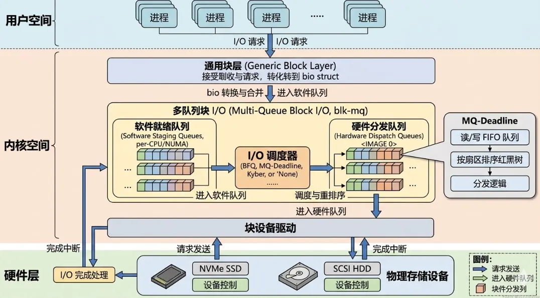 结合调度器策略(如 mq-deadline 或 bfq),blk-mq 能实现高吞吐、低延迟和公平性,是现代 Linux 存储性能优化的核心。