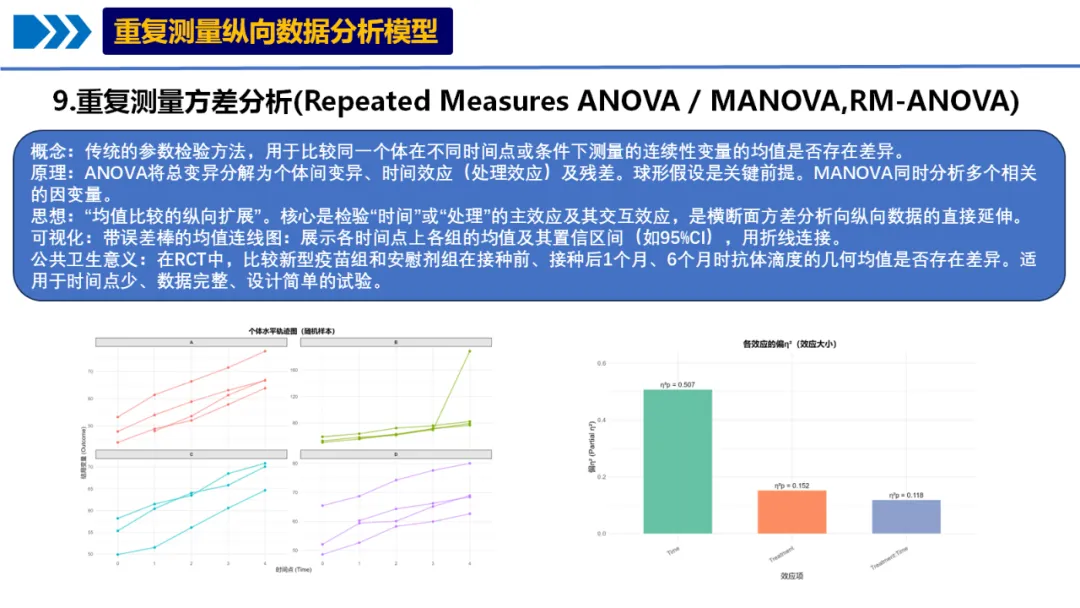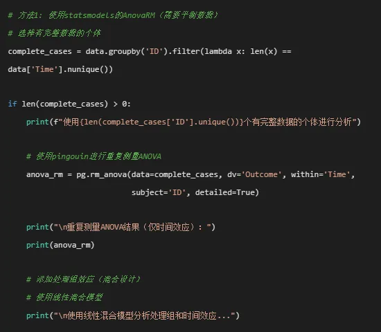 # # 安装所需包# pip install pandas numpy matplotlib seaborn scipy statsmodels pingouin python-docx openpyxl# ============================================# 重复测量ANOVA/MANOVA分析完整代码(Python版)- 修正版# ============================================import osimport pandas as pdimport numpy as npfrom pathlib import Pathimport warningswarnings.filterwarnings('ignore')# 导入必要的库import matplotlib.pyplot as pltimport seaborn as snsfrom scipy import statsimport statsmodels.api as smfrom statsmodels.formula.api import olsfrom statsmodels.stats.anova import AnovaRMfrom statsmodels.stats.multicomp import pairwise_tukeyhsdimport pingouin as pgfrom itertools import combinationsimport mathfrom docx import Documentfrom docx.shared import Inches, Ptfrom docx.enum.text import WD_ALIGN_PARAGRAPHfrom docx.enum.table import WD_ALIGN_VERTICAL# 设置中文显示plt.rcParams['font.sans-serif'] = ['SimHei', 'Microsoft YaHei', 'DejaVu Sans']plt.rcParams['axes.unicode_minus'] = False# 设置工作目录为桌面desktop_path = str(Path.home() / "Desktop")os.chdir(desktop_path)# 创建结果文件夹results_dir = "9-RM-ANOVA结果"if not os.path.exists(results_dir): os.makedirs(results_dir)# ============================================# 1. 数据读取与预处理# ============================================# 读取数据print("正在读取数据...")try:# 尝试读取Excel文件 data_full = pd.read_excel("longitudinal_data(示例).xlsx", sheet_name='Full_Dataset') data_simple = pd.read_excel("longitudinal_data(示例).xlsx", sheet_name='Simple_Dataset')except Exception as e:print(f"读取文件失败: {e}")# 尝试其他可能的文件名 try: data_full = pd.read_excel("longitudinal_data.xlsx", sheet_name='Full_Dataset') data_simple = pd.read_excel("longitudinal_data.xlsx", sheet_name='Simple_Dataset') except:print("请确保Excel文件在桌面上")exit()# 使用Simple_Dataset进行分析print("数据预处理...")data = data_simple.copy()# 转换数据类型data['ID'] = data['ID'].astype('category')data['Time'] = data['Time'].astype('category')data['Treatment'] = data['Treatment'].astype('category')data['Sex'] = data['Sex'].astype('category')data['School_ID'] = data['School_ID'].astype('category')# 删除完全缺失Outcome的行data = data.dropna(subset=['Outcome']).reset_index(drop=True)# 查看数据结构print("\n数据基本信息:")print(f"数据形状: {data.shape}")print(f"变量类型:")print(data.dtypes)print("\n样本量统计:")print(f"总观测数: {len(data)}")print(f"独立个体数: {data['ID'].nunique()}")print(f"时间点数: {data['Time'].nunique()}")print(f"处理组: {', '.join(data['Treatment'].cat.categories)}")# 检查数据平衡性balance_check = data.groupby('ID').size().agg(['min', 'max', 'mean', 'std'])print("\n数据平衡性检查:")print(f"最小时间点数: {balance_check['min']}")print(f"最大时间点数: {balance_check['max']}")print(f"平均时间点数: {balance_check['mean']:.2f}")print(f"时间点数标准差: {balance_check['std']:.2f}")# ============================================# 2. 重复测量ANOVA分析# ============================================print("\n" + "=" * 60)print("开始重复测量ANOVA分析...")print("=" * 60)# 使用pingouin进行重复测量ANOVA# 注意:pingouin要求平衡数据,这里我们处理缺失数据# 为每个个体填充缺失时间点data_pivot = data.pivot_table(index=['ID', 'Treatment', 'Age', 'Sex', 'Baseline_Score', 'School_ID'], columns='Time', values='Outcome').reset_index()# 检查每个个体是否都有所有时间点的数据missing_ids = data_pivot[data_pivot.isnull().any(axis=1)]['ID'].unique()if len(missing_ids) > 0:print(f"注意: {len(missing_ids)}个个体有缺失时间点数据")