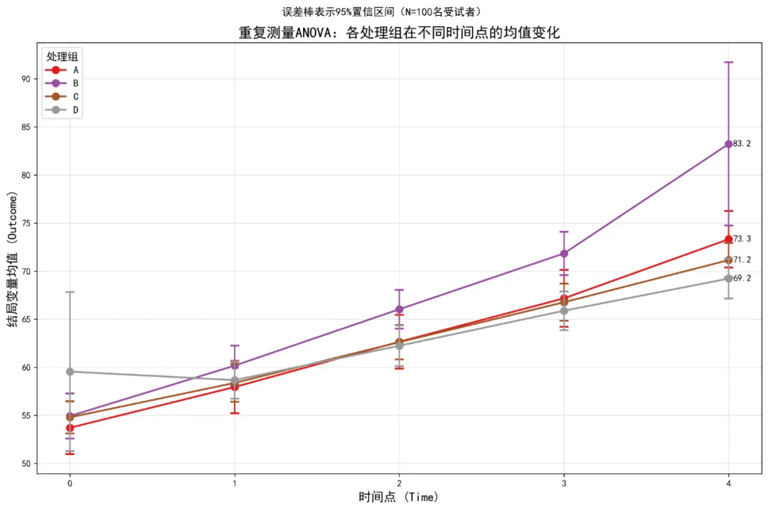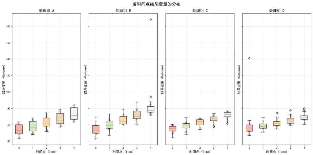 # 准备数据 data_mixed = data.copy() data_mixed['Time'] = data_mixed['Time'].astype(str)# 使用statsmodels的混合线性模型 md = sm.MixedLM.from_formula("Outcome ~ Time * Treatment", data_mixed, groups=data_mixed["ID"] ) mdf = md.fit()print("\n线性混合模型结果:")print(mdf.summary())# 提取固定效应 fixed_effects = mdf.fe_paramsprint("\n固定效应估计:")print(fixed_effects)# 使用pingouin的混合ANOVA(需要平衡数据)# 尝试使用pingouin的混合ANOVA try: mixed_anova = pg.mixed_anova(data=complete_cases, dv='Outcome', within='Time', between='Treatment', subject='ID')print("\n混合ANOVA结果:")print(mixed_anova)# 计算效应量 mixed_anova['np2'] = mixed_anova['F'] * mixed_anova['DF1'] / ( mixed_anova['F'] * mixed_anova['DF1'] + mixed_anova['DF2'])print("\n混合ANOVA结果(含偏η²):")print(mixed_anova[['Source', 'F', 'DF1', 'DF2', 'p-unc', 'np2']])# 保存ANOVA结果 anova_results = mixed_anova.copy() except Exception as e:print(f"混合ANOVA失败: {e}")print("使用线性混合模型结果作为主要分析") anova_results = Noneelse:print("没有完整的个体数据,使用所有可用数据") anova_results = None# ============================================# 3. 事后检验(Post-hoc Tests)# ============================================print("\n" + "=" * 60)print("开始事后检验...")print("=" * 60)# 时间主效应的事后检验if anova_results is not None and 'Time'in anova_results['Source'].values:print("\n时间点之间的配对比较(Tukey校正):")# 使用statsmodels的Tukey HSD检验 tukey = pairwise_tukeyhsd(endog=data['Outcome'].dropna(), groups=data['Time'].astype(str), alpha=0.05)print(tukey.summary())# 创建事后检验结果表 - 修正列名问题# 注意:tukey.summary()返回的是Summary对象,我们需要处理列名中的空格 summary_df = tukey.summary()# 将summary转换为DataFrame并处理列名 pairwise_time_df = pd.DataFrame(data=summary_df.data[1:], columns=summary_df.data[0])# 重命名列名,将空格替换为下划线 pairwise_time_df.columns = [col.strip().replace(' ', '_').replace('-', '_') for col in pairwise_time_df.columns]print(f"\n处理后的事后检验数据列名: {list(pairwise_time_df.columns)}")# 处理组与时间的交互效应简单效应分析print("\n各时间点上处理组的简单效应分析:") simple_effects = []for time_point in sorted(data['Time'].unique()): time_data = data[data['Time'] == time_point]if len(time_data['Treatment'].unique()) > 1:# 单因素ANOVA formula = f'Outcome ~ Treatment' model = ols(formula, data=time_data).fit() anova_table = sm.stats.anova_lm(model, typ=2)print(f"\n时间点 {time_point}:")print(anova_table)# 提取结果for idx, row in anova_table.iterrows():if idx == 'Treatment': simple_effects.append({'Time': time_point,'Source': 'Treatment','F': row['F'],'p': row['PR(>F)'],'df1': row['df'],'df2': anova_table.loc['Residual', 'df'] }) simple_effects_df = pd.DataFrame(simple_effects) if simple_effects else None# ============================================# 4. 描述性统计# ============================================print("\n" + "=" * 60)print("计算描述性统计...")print("=" * 60)desc_stats = data.groupby(['Treatment', 'Time']).agg( N=('Outcome', 'size'), Mean=('Outcome', 'mean'), SD=('Outcome', 'std'), Min=('Outcome', 'min'), Max=('Outcome', 'max')).reset_index()# 计算标准误和置信区间desc_stats['SE'] = desc_stats['SD'] / np.sqrt(desc_stats['N'])desc_stats['CI_lower'] = desc_stats['Mean'] - 1.96 * desc_stats['SE']desc_stats['CI_upper'] = desc_stats['Mean'] + 1.96 * desc_stats['SE']# 四舍五入desc_stats = desc_stats.round(3)print("\n描述性统计(均值±标准差):")print(desc_stats.to_string())# ============================================# 5. 可视化# ============================================print("\n" + "=" * 60)print("生成可视化图表...")print("=" * 60)# 5.1 带误差棒的均值连线图(主要可视化)plt.figure(figsize=(12, 8))colors = plt.cm.Set1(np.linspace(0, 1, len(desc_stats['Treatment'].unique())))for i, treatment in enumerate(desc_stats['Treatment'].unique()): treatment_data = desc_stats[desc_stats['Treatment'] == treatment].copy()# 按Time排序 treatment_data = treatment_data.sort_values('Time')# 将Time转换为字符串用于绘图 treatment_data['Time_str'] = treatment_data['Time'].astype(str)# 绘制连线 plt.plot(treatment_data['Time_str'], treatment_data['Mean'],'o-', color=colors[i], linewidth=2, markersize=8, label=treatment)# 绘制误差棒 plt.errorbar(treatment_data['Time_str'], treatment_data['Mean'], yerr=1.96 * treatment_data['SE'], fmt='none', color=colors[i], capsize=5, capthick=2)# 添加最后一个时间点的标签if len(treatment_data) > 0: last_point = treatment_data.iloc[-1] plt.annotate(f'{last_point["Mean"]:.1f}', xy=(len(treatment_data) - 1, last_point['Mean']), xytext=(5, 0), textcoords='offset points', ha='left', va='center', fontsize=10)plt.title('重复测量ANOVA:各处理组在不同时间点的均值变化', fontsize=16, fontweight='bold')plt.suptitle(f'误差棒表示95%置信区间(N={data["ID"].nunique()}名受试者)', fontsize=12)plt.xlabel('时间点 (Time)', fontsize=14)plt.ylabel('结局变量均值 (Outcome)', fontsize=14)plt.legend(title='处理组', title_fontsize=12, fontsize=11, loc='best')plt.grid(True, alpha=0.3)plt.tight_layout()plt.savefig(f'{results_dir}/均值轨迹图.png', dpi=300, bbox_inches='tight')plt.show()# 5.2 个体轨迹图(随机选择部分个体)plt.figure(figsize=(14, 10))np.random.seed(123)sample_ids = np.random.choice(data['ID'].unique(), size=min(15, len(data['ID'].unique())), replace=False)sample_data = data[data['ID'].isin(sample_ids)].copy()# 按Treatment分组treatments = sample_data['Treatment'].unique()n_treatments = len(treatments)fig, axes = plt.subplots(1, n_treatments, figsize=(5 * n_treatments, 8), sharey=False)if n_treatments == 1: axes = [axes]for i, treatment in enumerate(treatments): ax = axes[i] treatment_data = sample_data[s