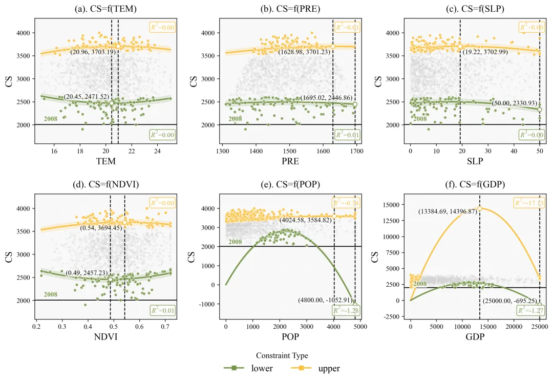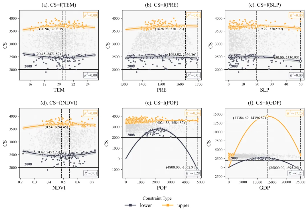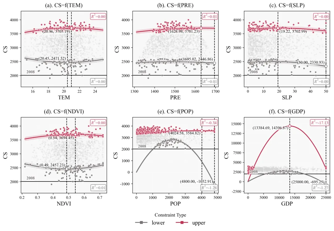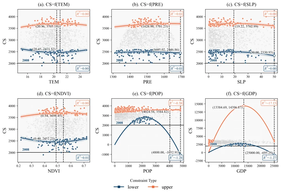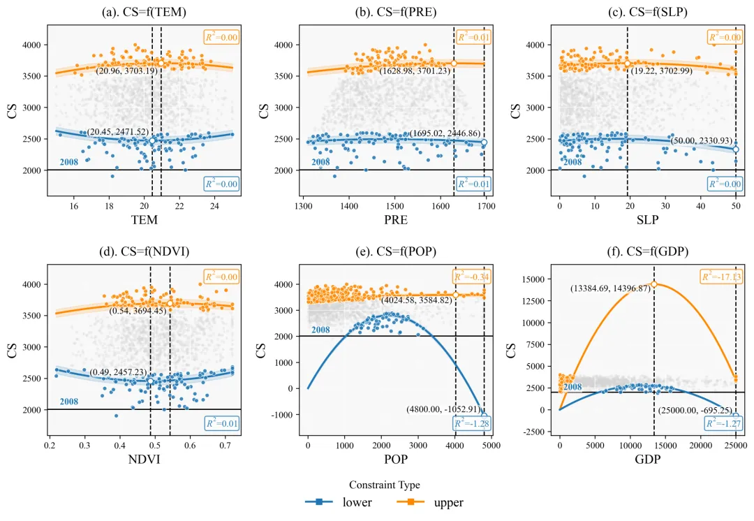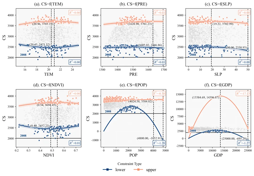 为了实现这一目标,我们的代码摒弃了常规回归,采用了分位数回归方法。常规回归努力寻找数据云团的重心,而分位数回归则专门针对数据云团的边缘进行拟合。在代码设定中,上边界回归使用的是百分之九十五的分位数,这意味着拟合出的红线专门追踪那百分之五表现最优异的极端个体,从而精确描绘出在排除了其他隐性干扰因子后,当前自变量能够支撑目标变量达到的纯粹物理或生态上限。同理,下边界采用百分之五的分位数,拟合出的蓝线则代表了系统在最恶劣条件下的理论下限。此外,我们在回归公式中加入了二次多项式进行曲线拟合。因为在真实的科学现象中,几乎没有任何事物可以无限线性增长,物极必反是普遍规律。二次函数的引入赋予了模型自动寻找数据转折点的能力,也就是我们常说的阈值。