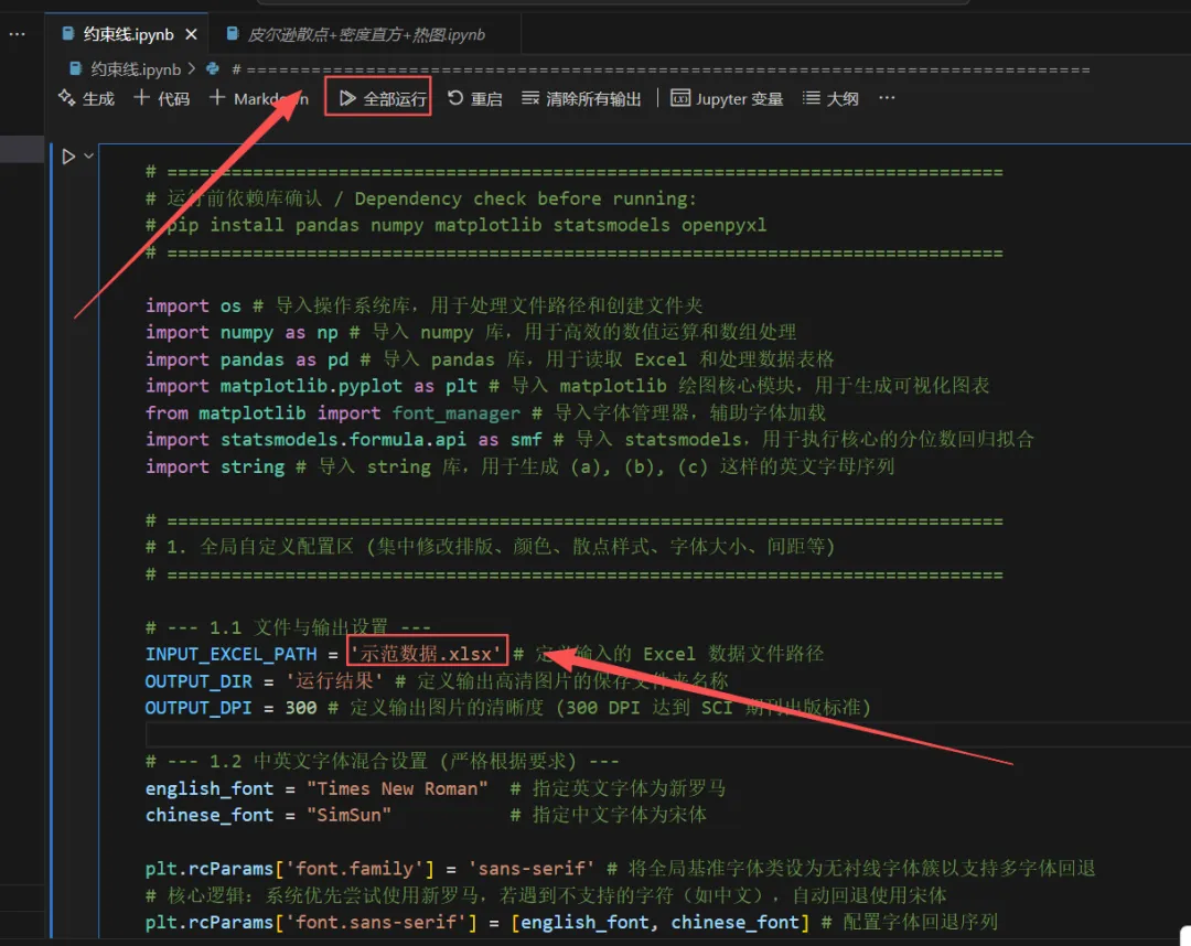 (1)找到代码中的1.1文件与输出设置部分。输入您的文件数据路径复制粘贴到双引号内。包括“Excel文件名称+后缀.xlsx”