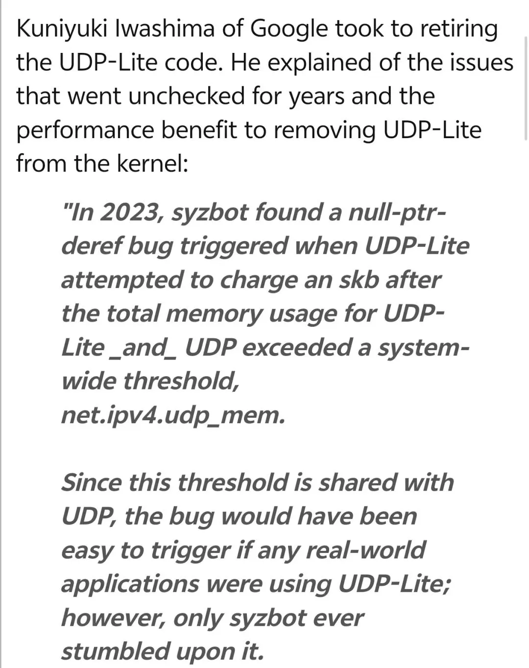 “在 2023 年,syzbot 发现了一个空指针解引用 bug,这个 bug 自 2016 年就存在,但直到 syzbot 才触发。说明 UDP-Lite 已经 7 年没人用了。”