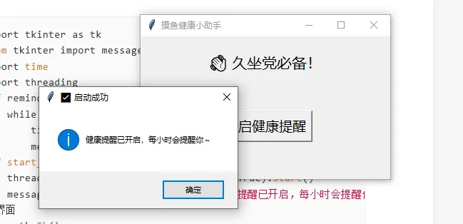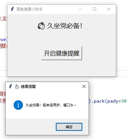 ✅ 告别 Python 环境:生成的 EXE,发给任何人,双击就跑,不用装 Python✅ 单文件干净利落:所有依赖打包进一个 EXE,不占空间,方便传输✅ 无黑框更优雅:隐藏命令行窗口,看起来和正经软件一模一样✅ 全场景适用:自动化工具、爬虫、办公小脚本、游戏 Demo… 通通能打包我们首先来写一个超级有用的小demo(久坐提醒),import tkinter as tkfrom tkinter import messageboximport timeimport threadingdef remind(): while True: time.sleep(3600) # 每小时提醒一次 messagebox.showinfo("💪 健康提醒", "久坐伤身!起来走两步,喝口水~")def start_remind(): threading.Thread(target=remind, daemon=True).start() messagebox.showinfo("✅ 启动成功", "健康提醒已开启,每小时会提醒你~")# 界面win = tk.Tk()win.title("摸鱼健康小助手")win.geometry("350x200")tk.Label(win, text="👋 久坐党必备!", font=("微软雅黑", 16)).pack(pady=20)tk.Button(win, text="开启健康提醒", font=("微软雅黑", 14), command=start_remind).pack(pady=30)win.mainloop()