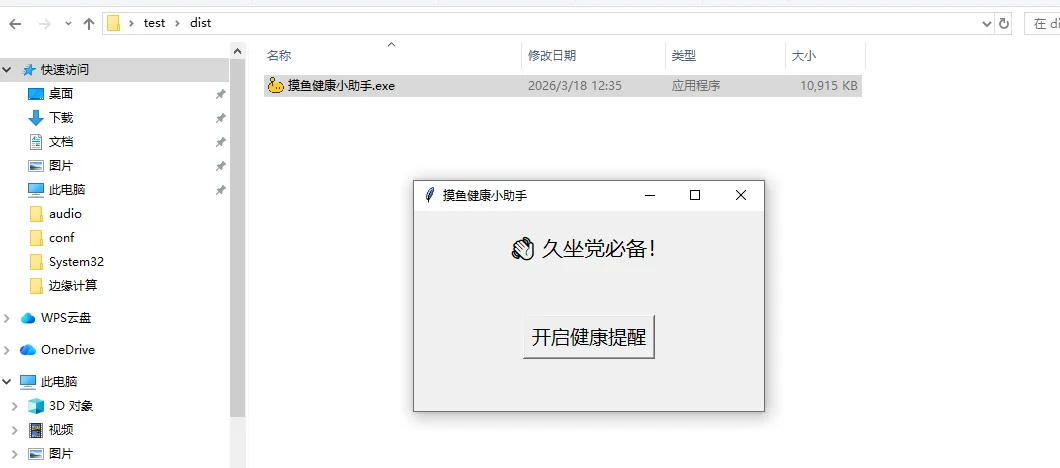 打包完成后,在 dist 文件夹里找到 摸鱼健康小助手.exe这个 Demo 只是个开始,你还能做: