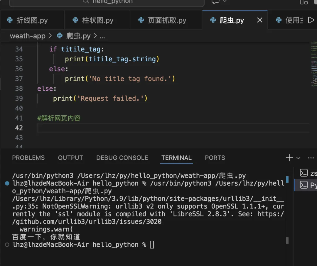 # 代码from bs4 import BeautifulSoupimport requestsurl = 'https://www.baidu.com/'response = requests.get(url)#防止乱码response.encoding = 'utf-8'if response.status_code == 200:#使用 beautiful Soup 解析网页内容 soup = BeautifulSoup(response.text, 'lxml') titile_tag = soup.title if titile_tag: print(titile_tag.string) else: print('No title tag found.')else: print('Request failed.')#解析网页内容