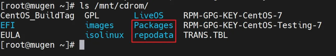 验证挂载:执行ls /mnt/cdrom,能看到Packages(软件包目录)、repodata(索引目录),说明挂载成功。