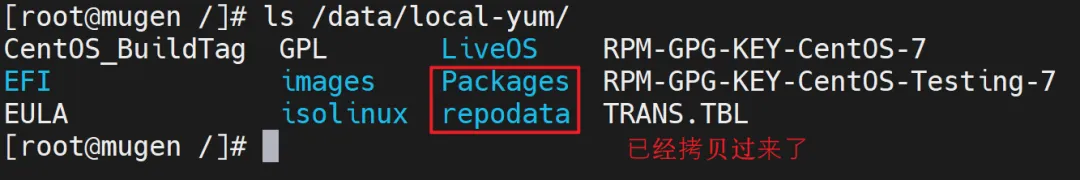 # 创建本地YUM仓目录mkdir -p /data/local-yum# 复制镜像内所有软件包(耐心等待,耗时1-2分钟)cp -r /mnt/cdrom/* /data/local-yum/