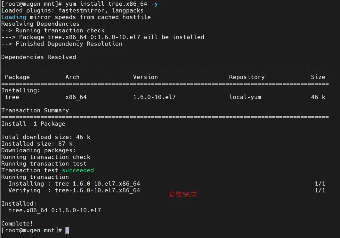 出现Complete!提示,代表本地YUM仓正常运行;若提示找不到包,回头检查挂载路径、配置文件、缓存是否更新即可。
