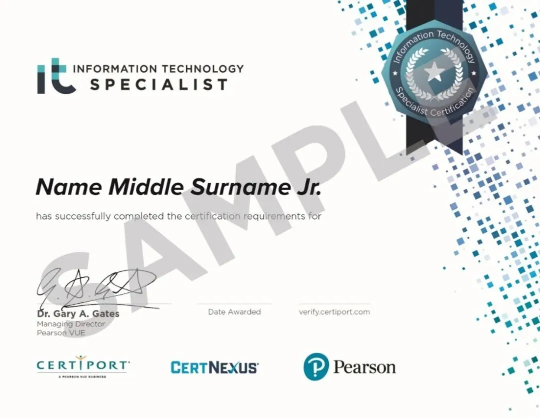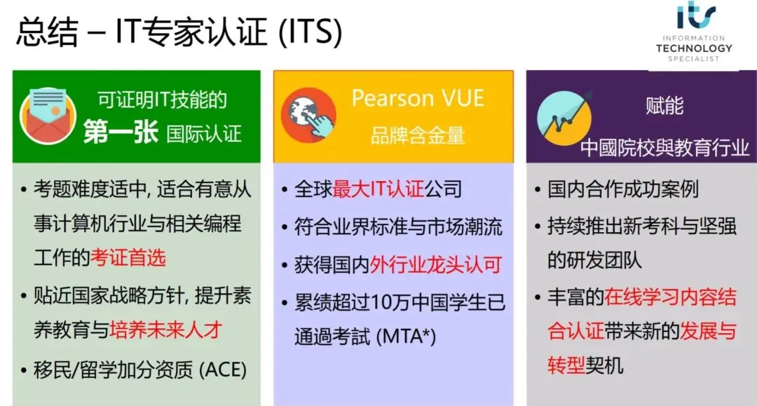 ITS的英文全称(IT Specialist Certification)信息技术专家认证。由于ITS证书是微软MTA证书的继任者,在全球普遍受到认可。由国际认证机构 Certiport 推出,由答得喵考试中心负责具体支持与实施。ITS认证是专门面向,设定了IT技术职业规划,有志成为 IT 专业技术人员的候选人,所开发的技术序列的国际认证。ITS认证考试项目的背景之一,是因为,微软决定退出MTA证书计划,进而将更多精力放到,围绕微软云Azure平台及其相关产品的认证项目上,比如:微软MCF认证。所以,ITS认证考试的很多科目,都是为了填补微软MTA认证退休导致的,在相关技术认证项目的缺失,毕竟这些科目背后的技术,在可预见的未来,仍然有相当重要的用途与发展。此外,ITS认证还通行180+个国家,在全球几千所中学、大学中都可作为有效的学分抵扣凭证(具体学校名录请查询培生教育相关网页),有留学规划的学员不该错过ITS认证!当然,ITS考试也不只是为了接替MTA考试,更多的背景还是因为,随着雇主对雇员的IT技能需求,与雇员实际掌握的IT技能,之间的差距不断拉大,相关IT认证需求在不断加大。所以,ITS证书并不仅仅是替代原来的MTA证书,从构成上来说,作为继承的部分:ITS认证同样包括软件开发、数据库管理、网络安全、移动设备管理与开发四个方向的技术认证;作为与时俱进的部分:ITS认证推出了几个符合当前技术趋势的认证,比如:AI、云计算、算法思维等。ITS认证考试,使用情景模拟、个案研究以及其他更为复杂的方式进行测评,可以更完整、更准确地考核考生IT专业技术的深度,作为ITS证书持有者在专业技能上的有利佐证,使得ITS证书持有者充分展现个人在职场上的竞争优势。ITS认证证书可以用于证明,计划从事IT职业的学生和求职者的基本技术技能和知识。信息技术专家计划包含15个认证科目,帮助你发掘自己的潜能和激情,为开展专业的信息技术教育和培养当下紧缺的职业技能做好准备!