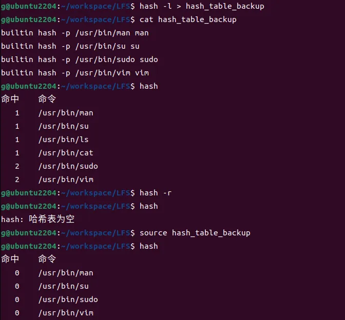 如果你想保留当前会话的哈希状态,可以用hash -l > hash_table_backup把列表导出到一个文本文件中。之后可以用source hash_table_backup来恢复它。