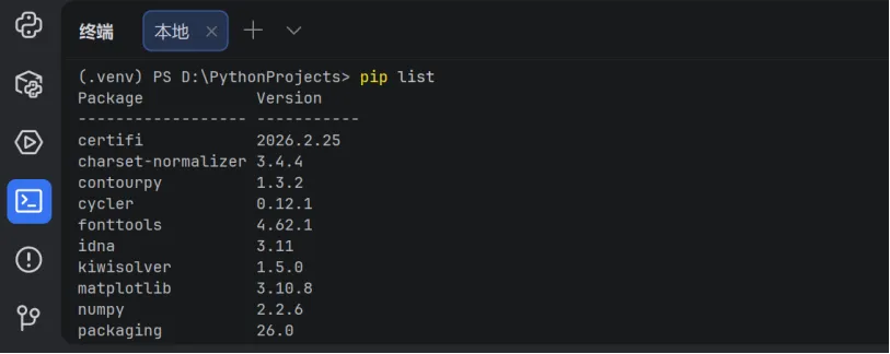 输入后,终端会列出所有用pip装过的库,以及对应的版本,方便检查哪些库已经装了、哪些需要更新。如下图所示: