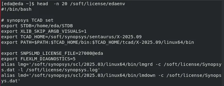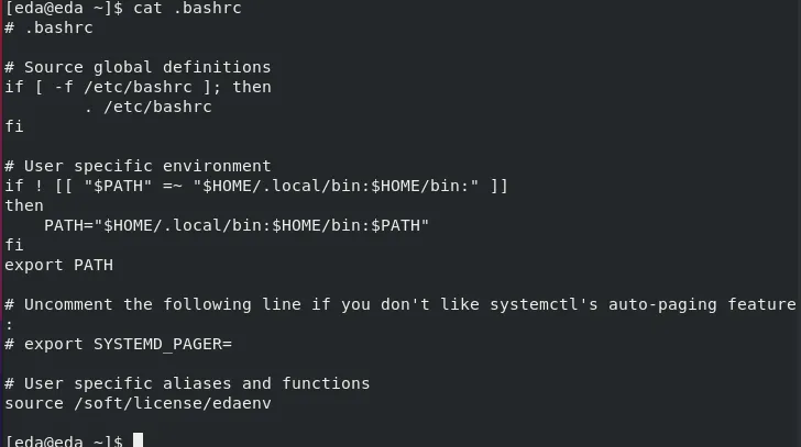 3、自定义环境变量:写入任意文件,通过source 自定义环境文件生效,自定义环境变量也可以通过echo “source /soft/license/edaenv”>>~/.bashrc写入到用户环境变量中实现自动加载