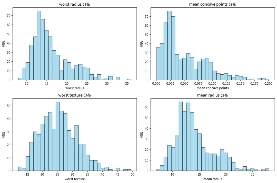 从图中可以看到,worst radius、worst perimeter等特征与诊断结果高度相关(负相关表示恶性时这些值较大)。我们保留所有特征进行后续建模,但在实际项目中,可能会选择 top-k 特征或使用更复杂的特征选择方法。某些特征的分布可能偏斜,我们可以进行对数转换、平方根转换等。这里我们先检查特征的分布。# 查看几个重要特征的分布important_features = ['worst radius', 'mean concave points', 'worst texture', 'mean radius']fig, axes = plt.subplots(2, 2, figsize=(12, 8))axes = axes.flatten()for i, feature in enumerate(important_features): axes[i].hist(df[feature], bins=30, alpha=0.7, color='skyblue', edgecolor='black') axes[i].set_title(f'{feature} 分布') axes[i].set_xlabel(feature) axes[i].set_ylabel('频数')plt.tight_layout()plt.savefig('outputs/文章/首周/特征分布.png', dpi=300, bbox_inches='tight')plt.show()