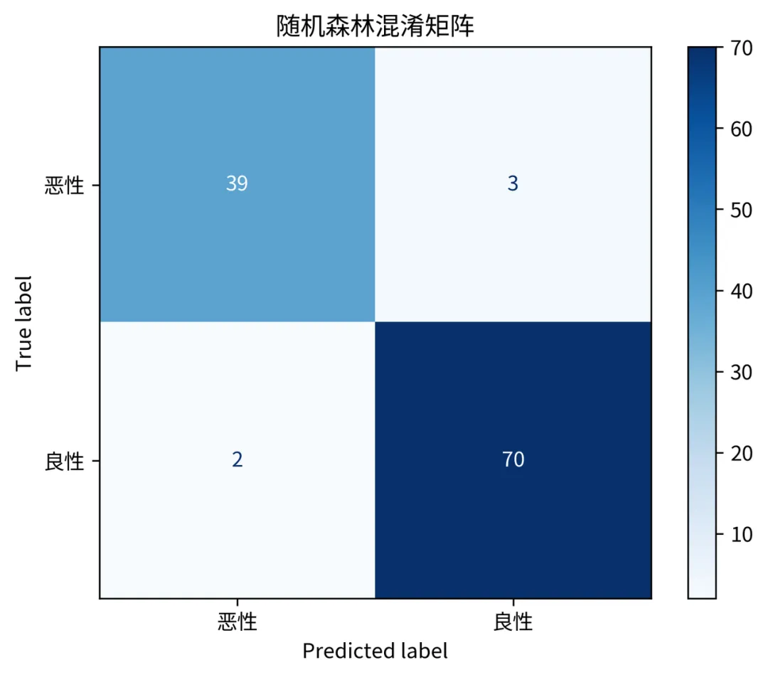 运行后,你可能会看到随机森林表现最好(准确率约0.96-0.98)。我们选择随机森林作为基础模型进行后续优化。5.模型评估:准确率、召回率、F1-score等指标解读准确率很高,是不是模型就完美了?不一定!我们需要更全面的评估,特别是对于医疗这种不平衡数据(恶性样本较少)。from sklearn.metrics import confusion_matrix, ConfusionMatrixDisplay# 使用随机森林模型best_model = models['随机森林']y_pred = best_model.predict(X_test)cm = confusion_matrix(y_test, y_pred, labels=[0, 1])# 可视化混淆矩阵disp = ConfusionMatrixDisplay(confusion_matrix=cm, display_labels=['恶性', '良性'])disp.plot(cmap='Blues')plt.title('随机森林混淆矩阵')plt.savefig('outputs/文章/首周/混淆矩阵.png', dpi=300, bbox_inches='tight')plt.show()